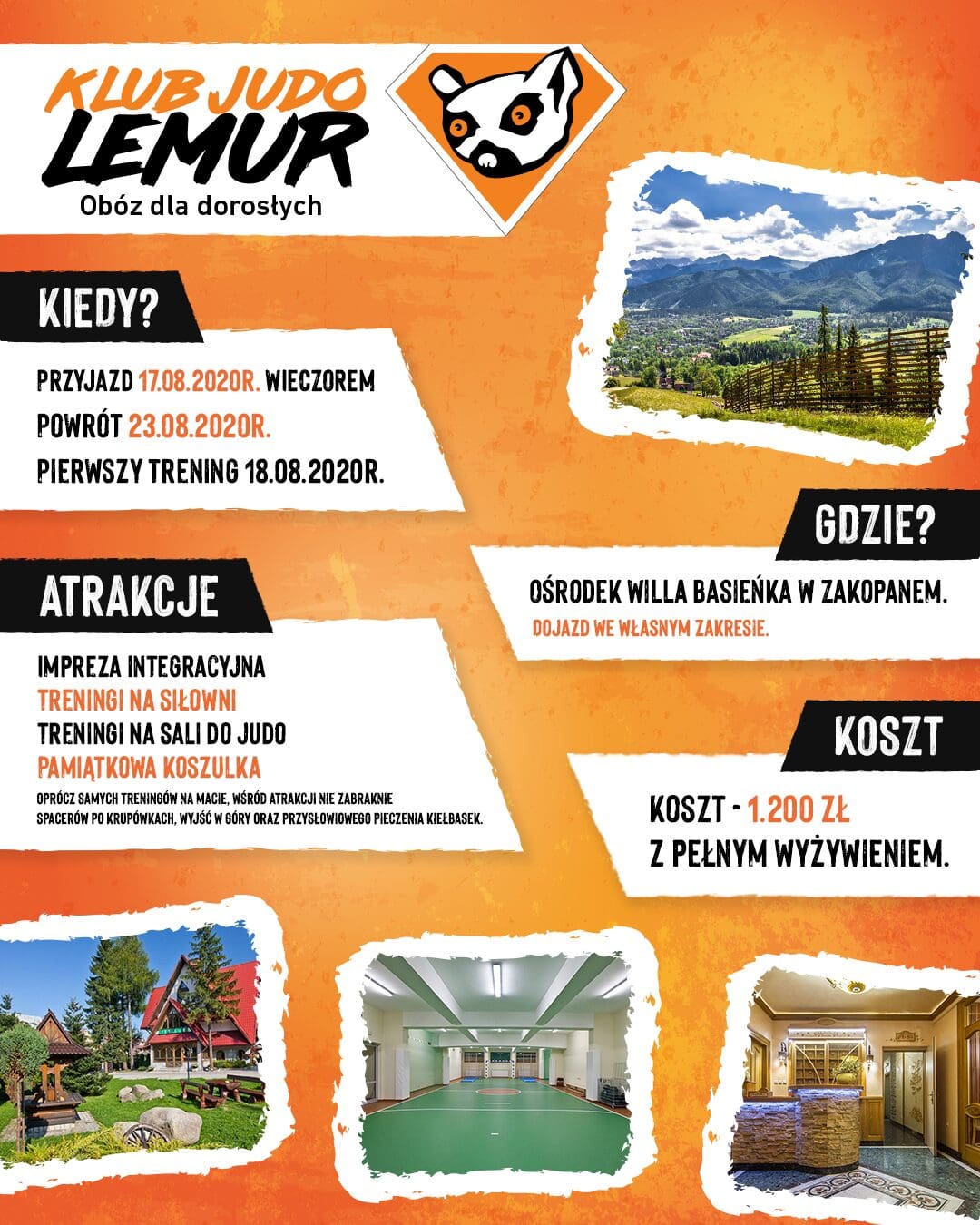 Obóz odbędzie się w dniach od 17.08 do 23.08.2020 r. w Zakopanem, a oprócz samych treningów na macie, wśród atrakcji nie zabraknie spacerów po Krupówkach, wyjść w góry oraz przysłowiowego pieczenia kiełbasek.